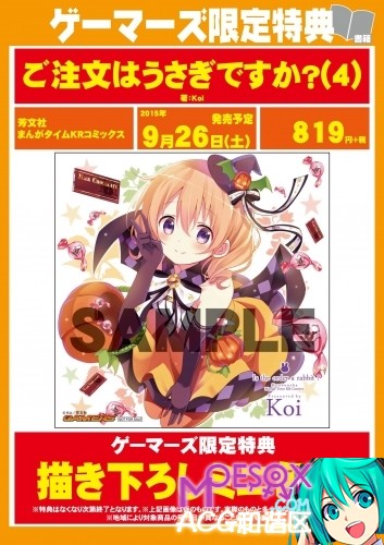 ![]() 明日26日に発売される『ご注文はうさぎですか?』コミック4巻の店舗ごとの特典イラストが公開されました。 <ゲーマーズ> 描き下ろしミニ色紙 ![]() <アニメイト> 複製ミニ色紙 ![]() <WonderGoo> ポストカード ![]() <とらのあな> 描き下ろしポストカード ![]() <まんが王> 描き下ろしイラストカード ![]() <メロンブックス> 描き下ろしクリアファイル ![]() <COMIC ZIN> 4Pリーフレット ![]() <三洋堂書店> 特製イラストカード ![]() 理世、千夜、紗路那三張單人繪真是讚!特別是千夜的修女裝扮(鼻血) 二期快來呀wwwwwwwwwww |