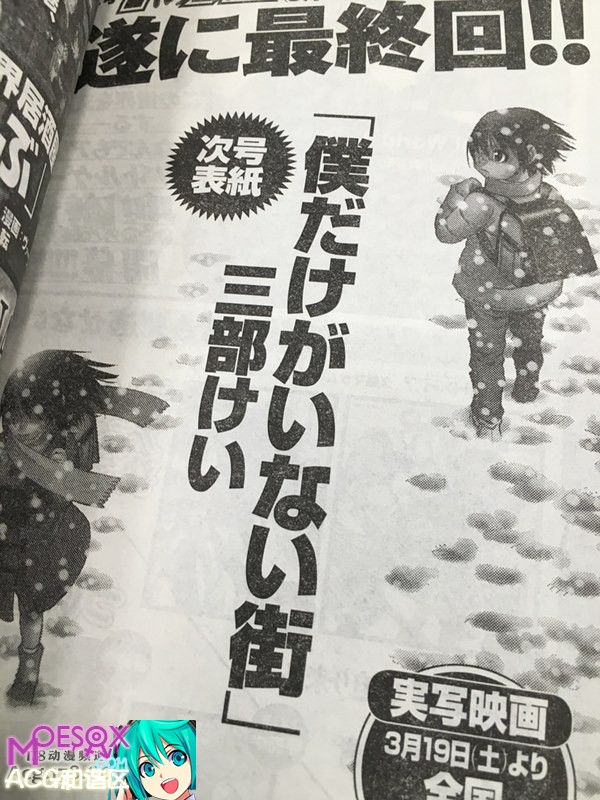 目前正在播出的动画「只有我不在的街道」的原作漫画,宣布了即将于次号「YOUNG ACE」上完结,这部连载了三年多的漫画也将就此告一段落。 漫画「只有我不在的街道」是日本漫画家三部敬创作的作品。故事讲述了拥有着「再上映」的能力的青年漫画家藤沼悟,在能力的作用下于惨剧发生前解决事件的故事。除了动画化以外,同样根据本作改编的真人电影版也将于2016年3月上映。 值得一提的是,漫画选在次号完结,也就是说同样为3月完结。漫画、动画、电影三方面的故事,都将在3月划上句号,这一点也是十分令人期待。到底这个故事在三个平台上的作品的结局会不会一样呢? |